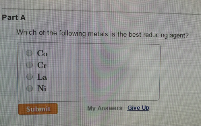 Solved Which Of The Following Metals Is The Best Reducing Chegg Com