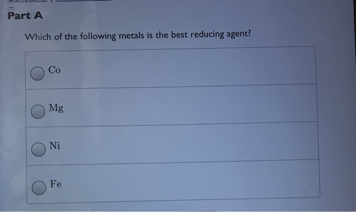 You just need to arrange it so that the most negative one is the strongest reducing agent. Who are the experts. Which of the following metals is the best reducing agent.